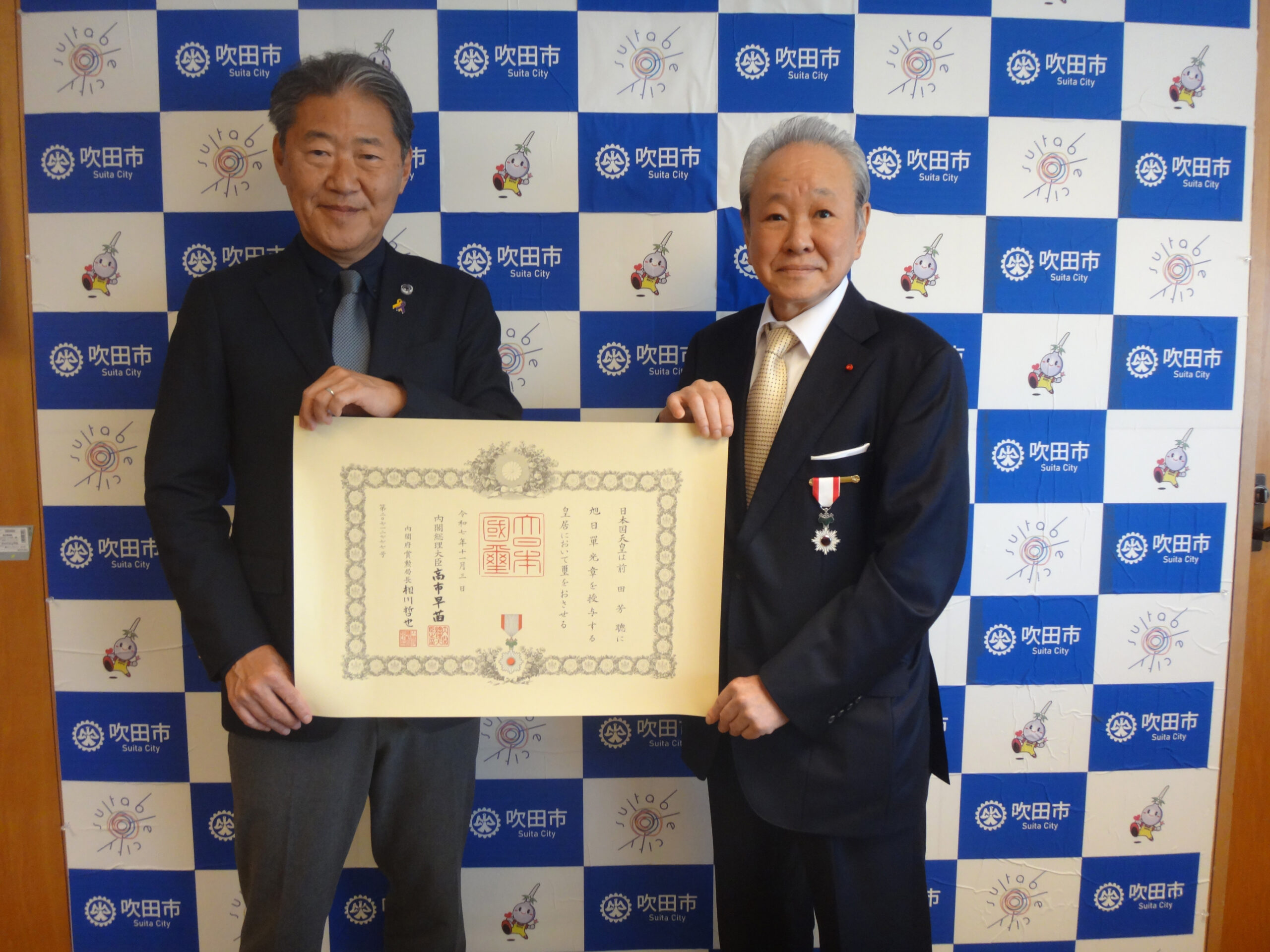 また11月28日には、前田会長が吹田市役所を訪問し、吹田市長 後藤圭二様に受章のご報告を申し上げました。